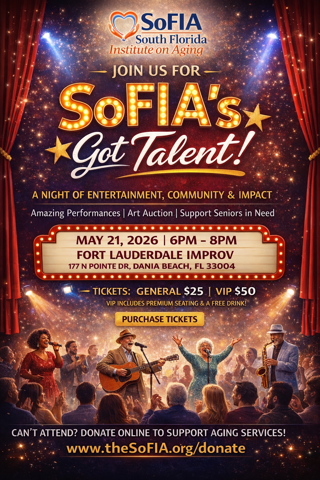The South Florida Institute on Aging (The SoFIA) is a women led, grassroots nonprofit organization who is focused on providing equitable and quality services to the lives of the aging community and their families in South Florida. With services that help seniors bridge gaps between them and their communities, The SoFIA is able to enrich the lives of seniors in South Florida as well as those around them. Help us continue our mission and support The SoFIA today!